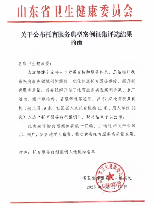 近日,山东省卫生健康委员会公布托育服务典型案例评选结果,我校托育中心凭借其在用人单位办托领域的创新实践与突出成效,成功入选“山东省托育服务典型案例”。